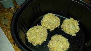 Here are the Crab cakes just put in the preheated basket (preheat Air Fryer to 400 degrees). I sprayed then with a little bit of Trader Joe's Coconut oil spray.